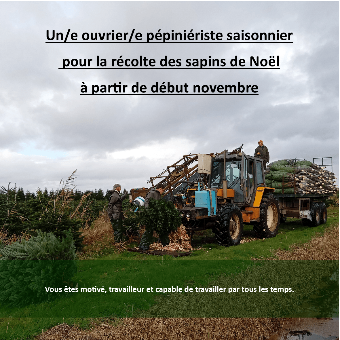 Tous les ans pour les sapins de Noël, nous recherchons des saisonniers pour la récolte des sapins. N'hésitez pas à nous faire parvenir votre CV par mail à pepinieres@pepinieres-bugnon.com